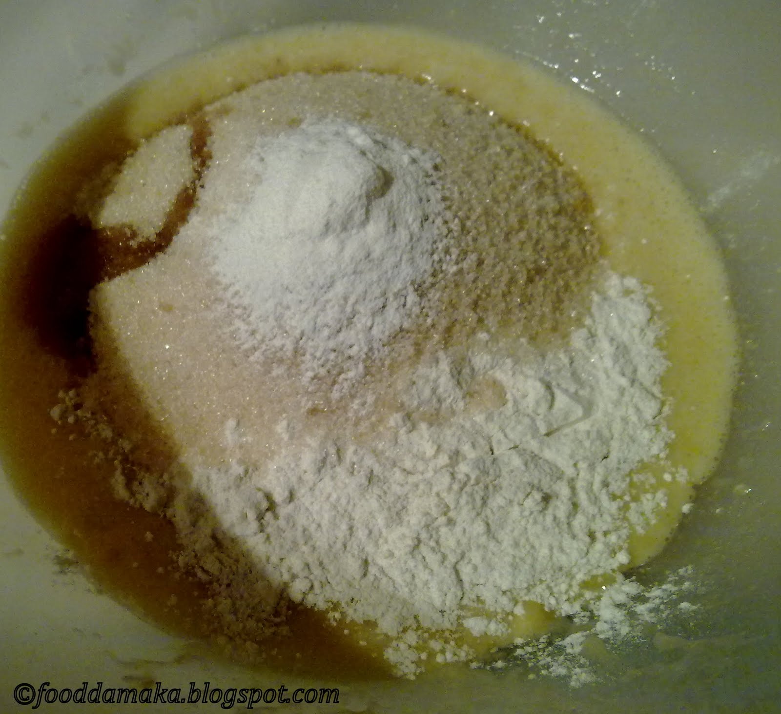 Adding golden caster sugar,flour,baking powder and vanilla essence..
