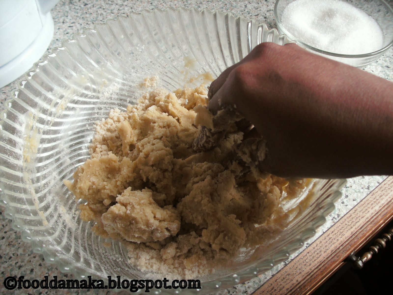 Add the flour and butter together in the mixing bowl, then rub with your fingers.Until it becomes crumbly. Add half a teaspoon of vanilla extract to the bowl and then mix in the sugar.